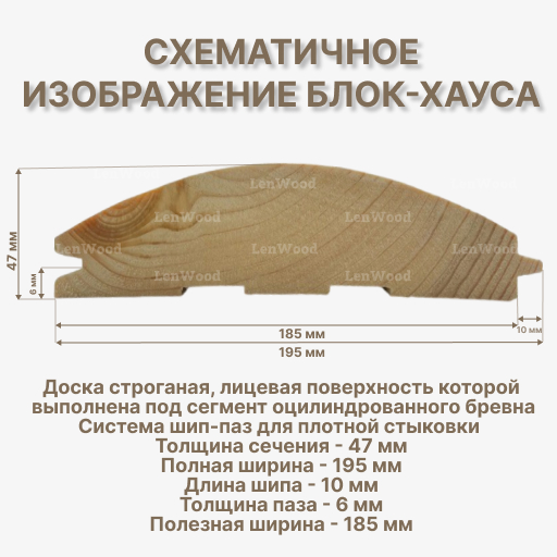Блок-хаус. Строганый пиломатериал с декоративной обработкой под вид бревна на лицевой стороне. Присутствует система шип-паз для комфортного монтажа и плотной стыковки. Доска с прямоугольным сечением толщиной 47 и шириной 195 мм.