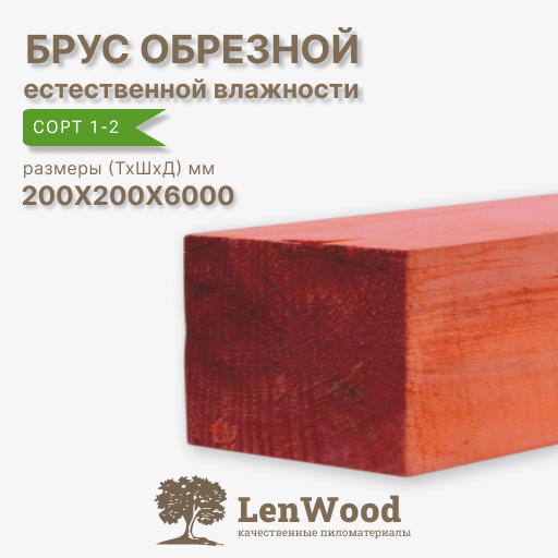 Цельный обрезной брус естественной влажности антисептированный (огнебиозащита). Имеет ровное квадратное сечение со сторонами 200x200 мм и длиной 6000 мм, допустимая погрешность размеров 1-2 мм.
