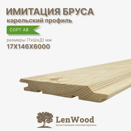 Имитация бруса "Карельский профиль". Отличается приспособленными для удобного скрытого монтажа длинным выступом-шипом с одной стороны и пазом с другой. Толщина составляет 17 мм при ширине 146 мм.